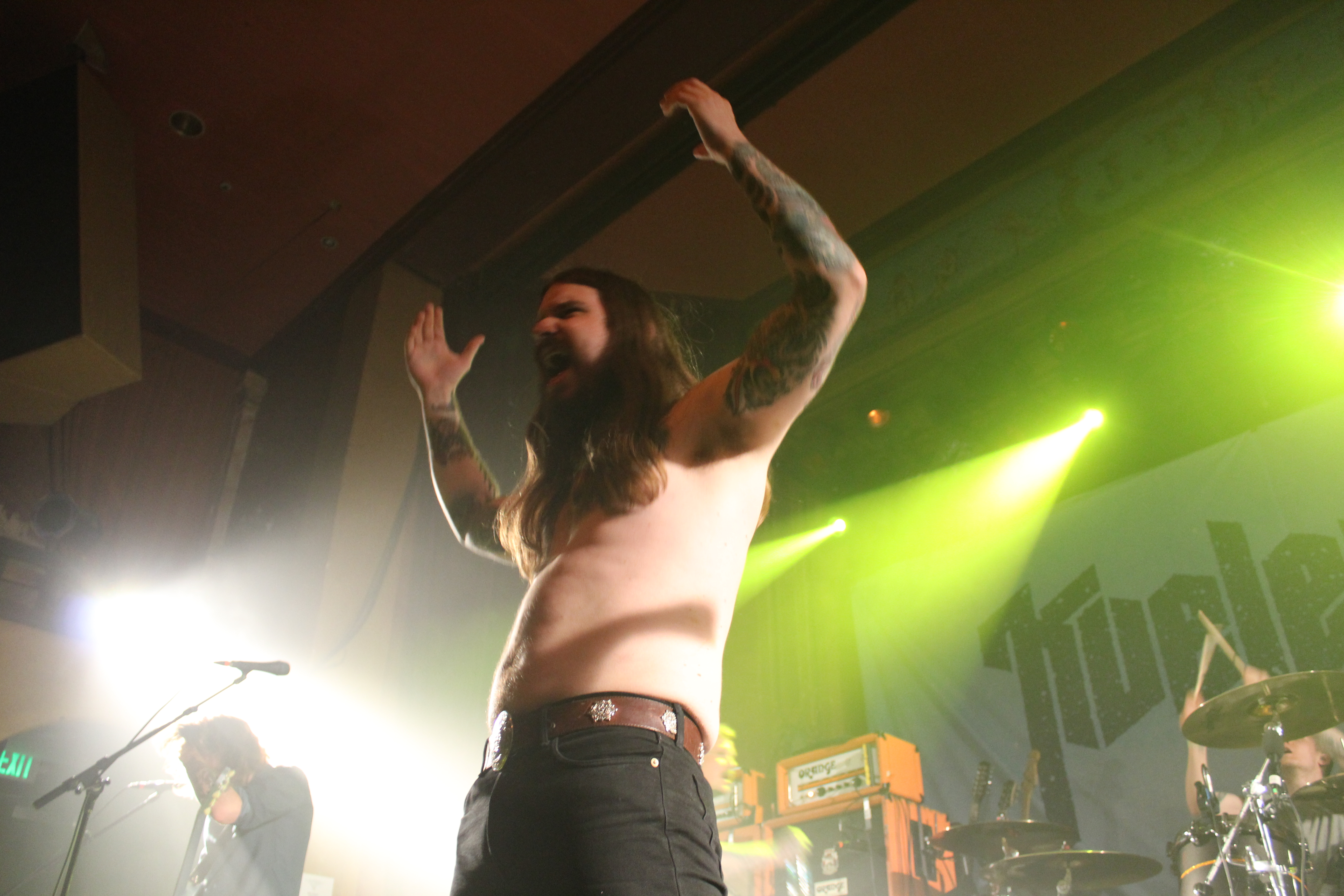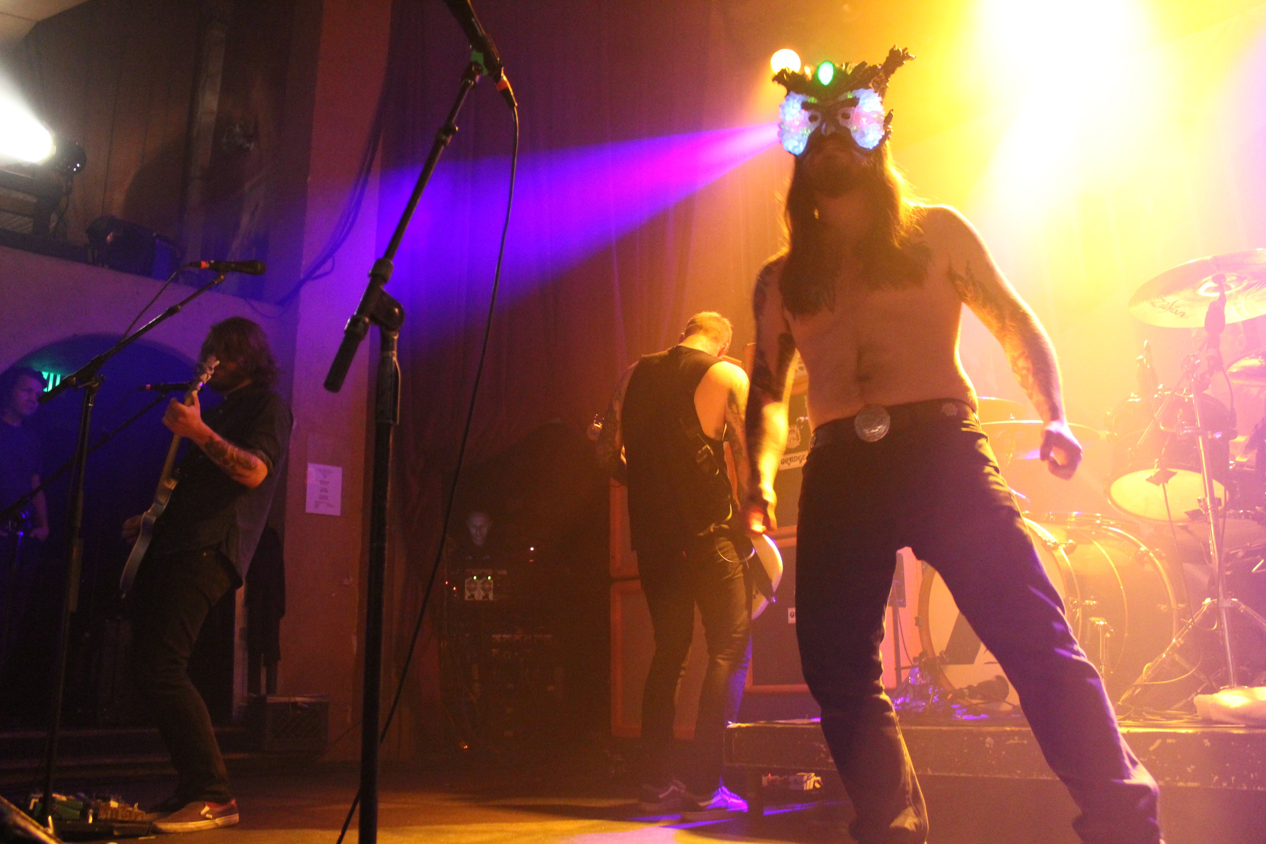 In terms of a touring bill, the pairing of Kvelertak and Torche (a band that really should be headlining any tour) seems like an odd combination. Torche employs a seriousness of craft and musical precision that appeals to other musicians, critics, and lovers of aged whisky. Whereas Kvelertak comes off aesthetically as a derivative of campy, performative European hard rock/metal from the 80s expressed in the image and sound of bands like Accept (a literal progenitor of Kvelertak) and Krokus. Not that European hard rock campiness is a bad thing. The topless emergence of Kvelertak’s singer, Erlend Hjelvik, on stage sporting his trademark stuffed owl headdress thingy at the outset of Kvelertak’s headlining set is not only hysterically entertaining (and reminiscent of Accept’s Udo Dirkschneider), but also makes for a stylistic complement to the aggressive vibe of the show’s opening number “Dendro” (a song from Kvelertak’s new album, Nattesferd).