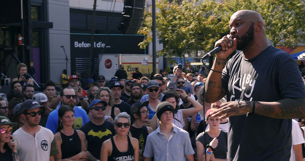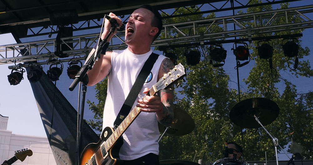 I kept one eye on the stage behind me to make sure I would get a good spot for P.O.S., and spotted him sitting on stage wearing a Kilby Court shirt, paying tribute to SLC’s long-running all ages venue and a stage where P.O.S. has performed many times. I must’ve not been looking too hard, because by the time The Flatliners’ set ended, the crowd was about 15 feet deep and I settled for an elevated spot on the splash pad.