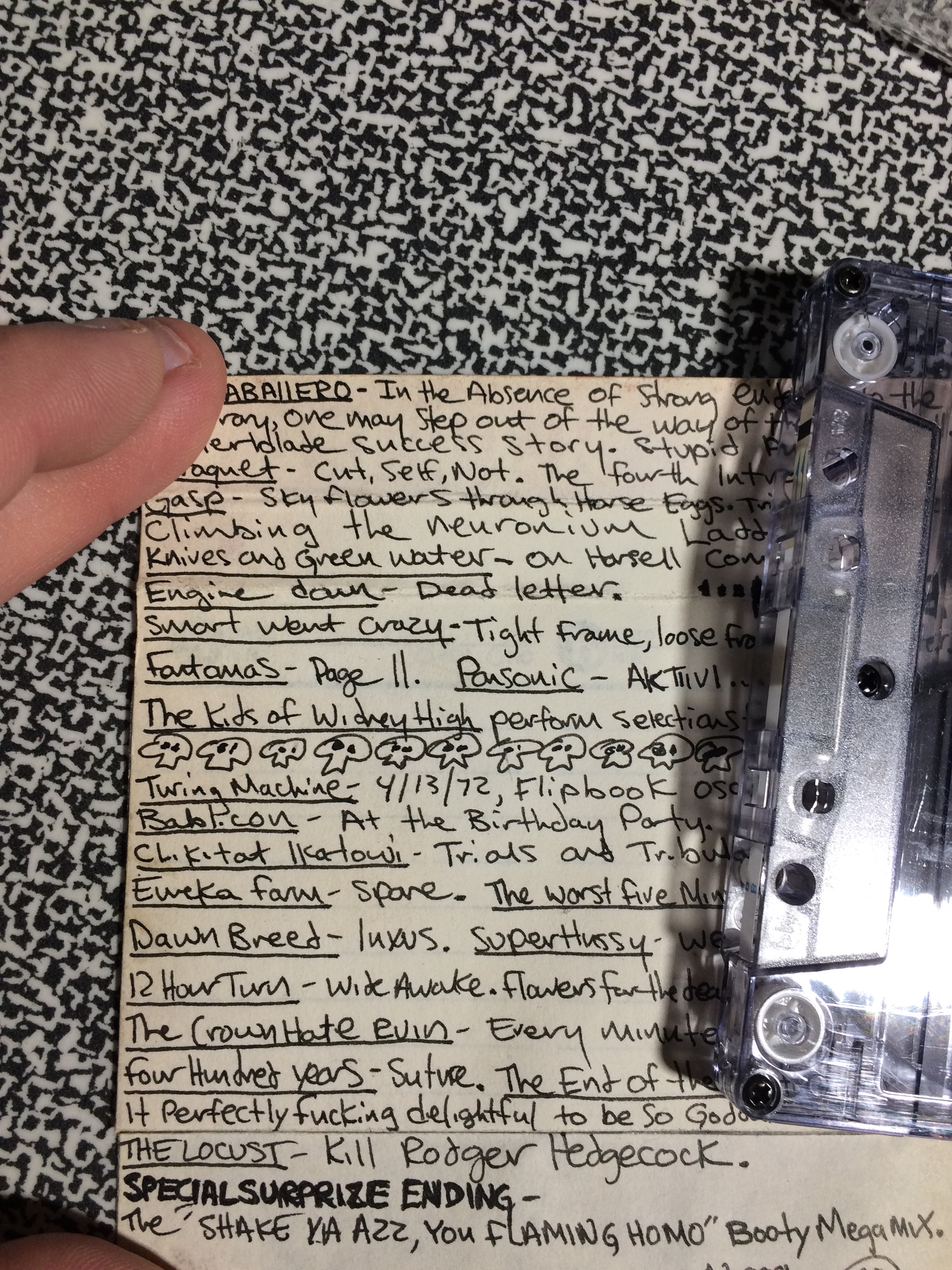 Some of my go-to’s were songs from The Frogs album My Daughter the Broad, “Kuntz” off of The Butthole Surfer’s Locust Abortion Technician, this bizarre tape of Snuggles the Bear that must have come from a serial box that is probably the most saccharine and obnoxious song ever written, and bad top 40’s pop from free cassingles that record stores in Burlington would have at the register.