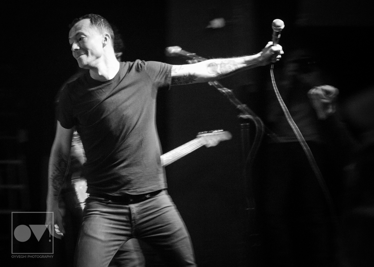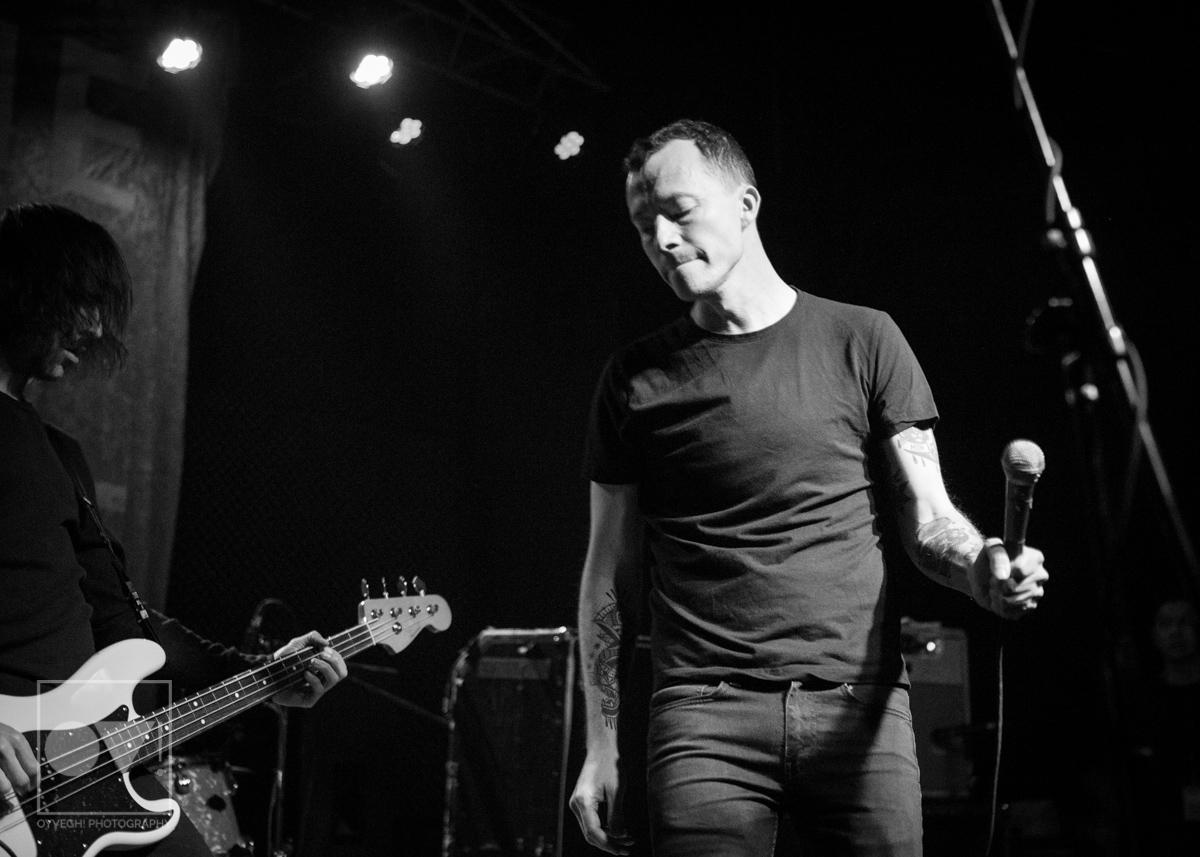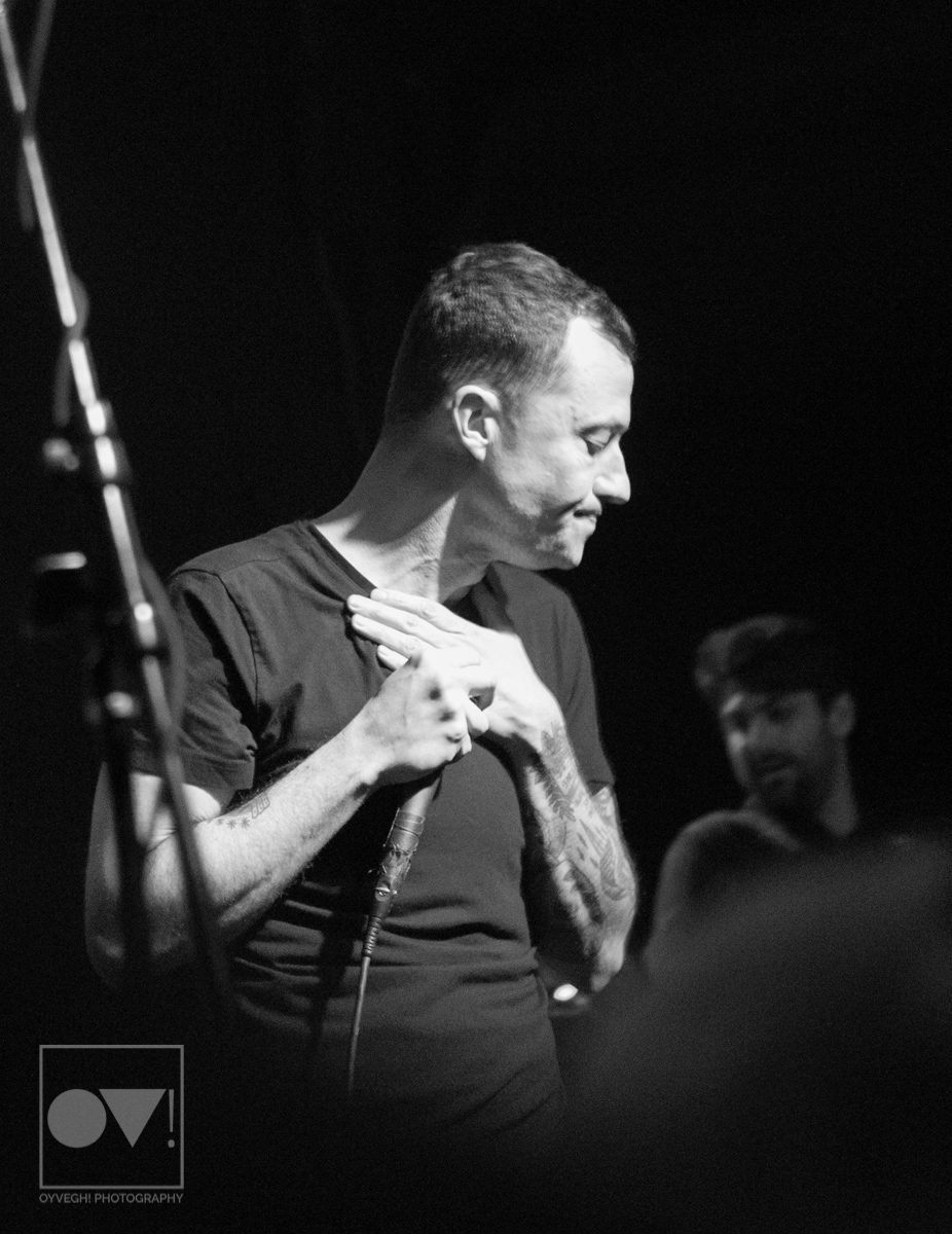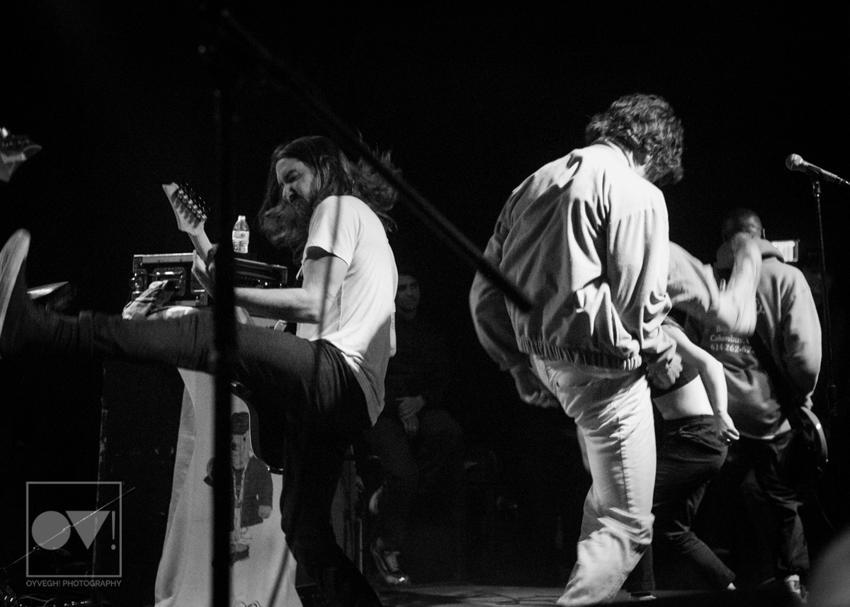 Yates seemed to exert himself so much he would take mini breaks, crouching down in front of drummer Daniel Fang, his back to the throng of people while bassist Franz Lyons and guitarists Pat McCrory and Brady Ebert kept the energy alive. After the pause, Yates would throw himself back into the arms of the crowd, pelting their faces with lyrics, straining his neck as he hollered into the mic.