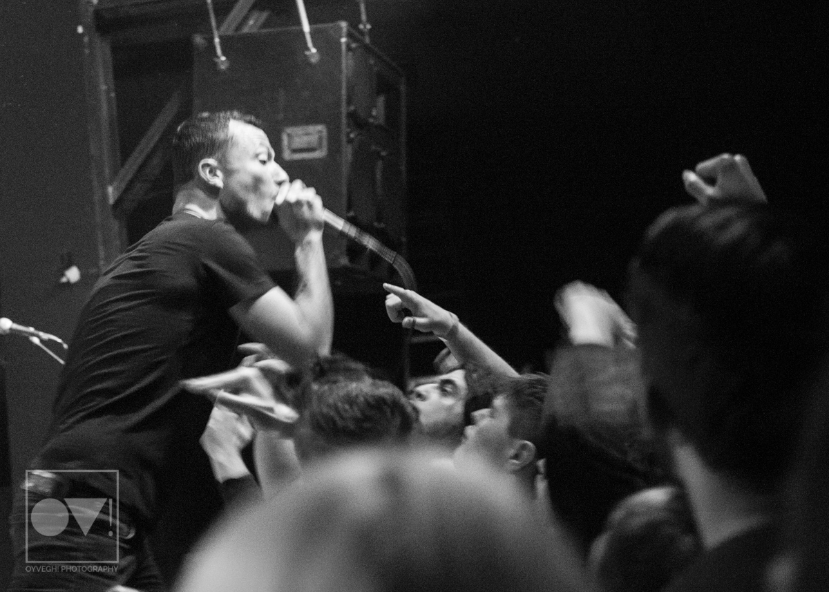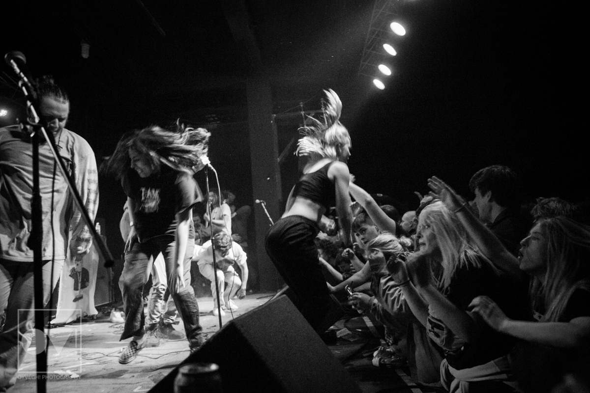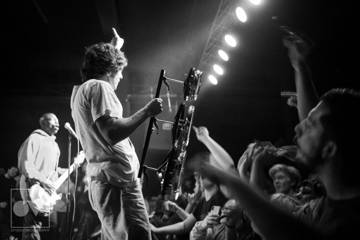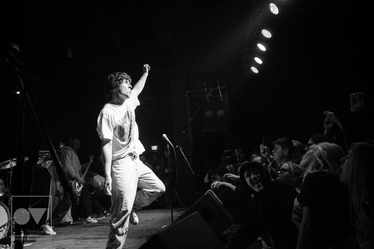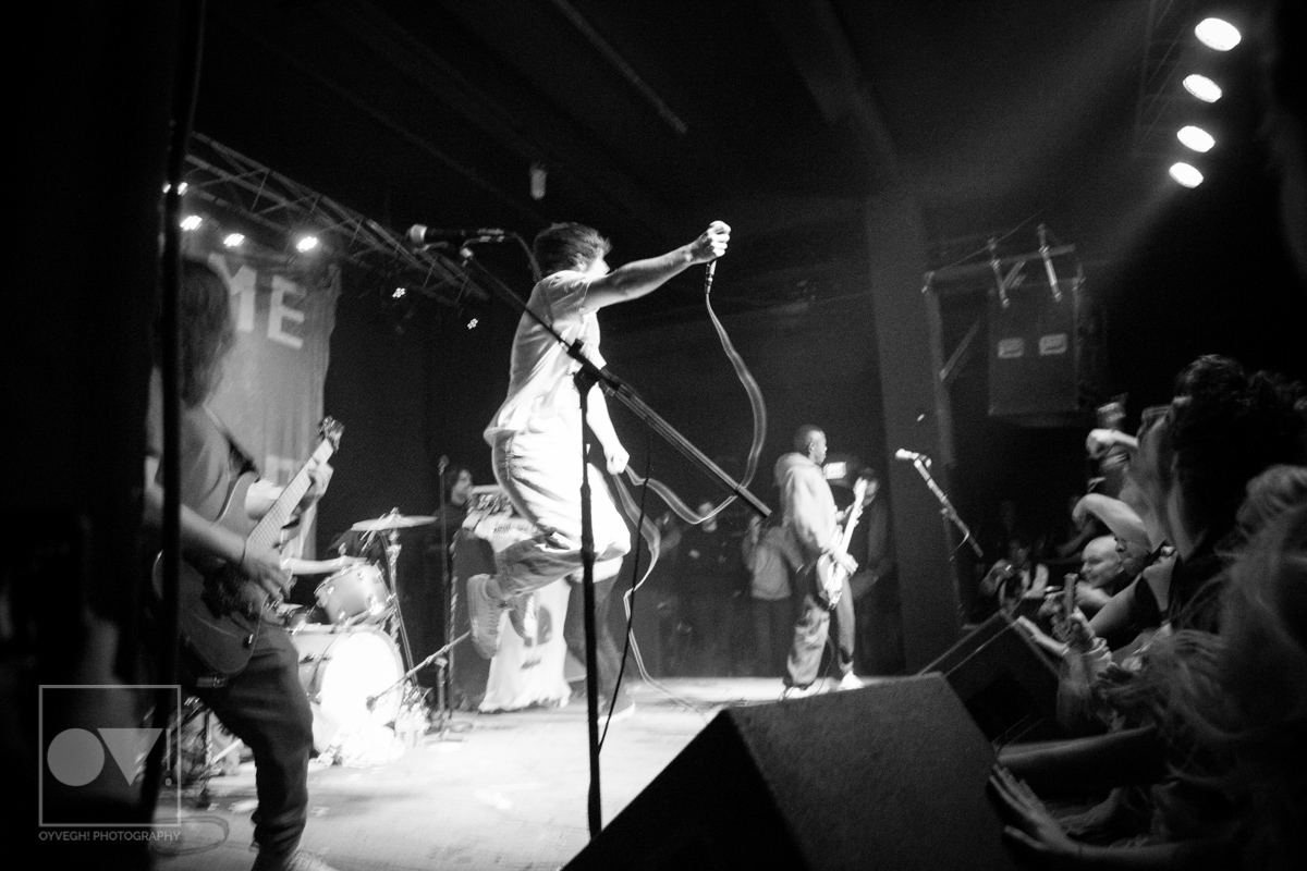 As songs like “Gravity” and “I Don’t Wanna Be Blind” played, the savage merry-go-round of guys and girls that would enter and exit the stage grew in intensity and number. Monitors and mic stands were knocked over every time someone would muster up the courage to jump the stage and surf back into the crowd. While most were lucky to be caught by waiting hands, some crash-landed onto the cement floor, only to dust themselves off and dive back in to try again. The insanity didn’t seem to bother the group, seamlessly maneuvering around people as they continued to play.