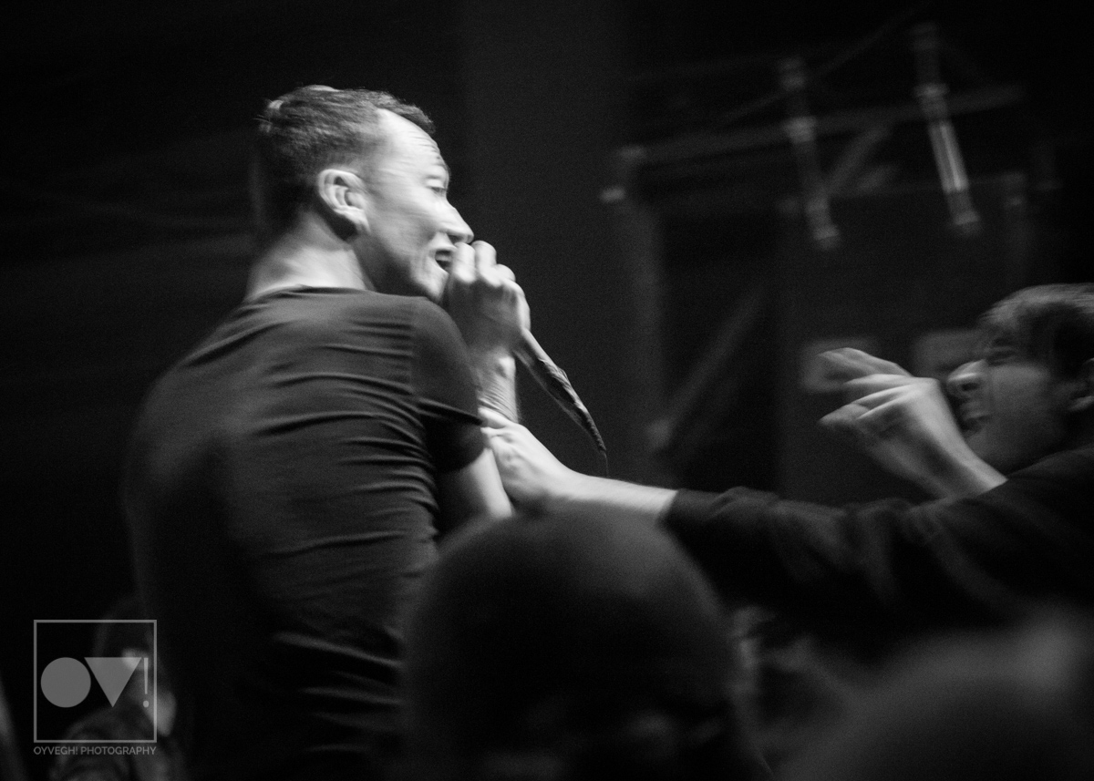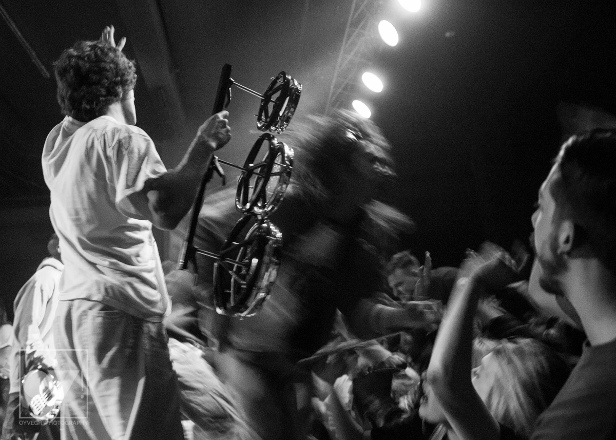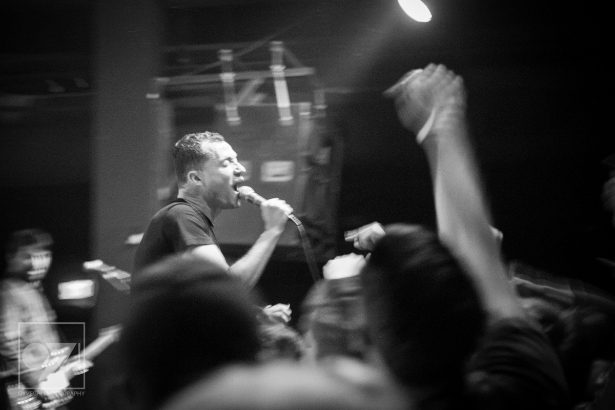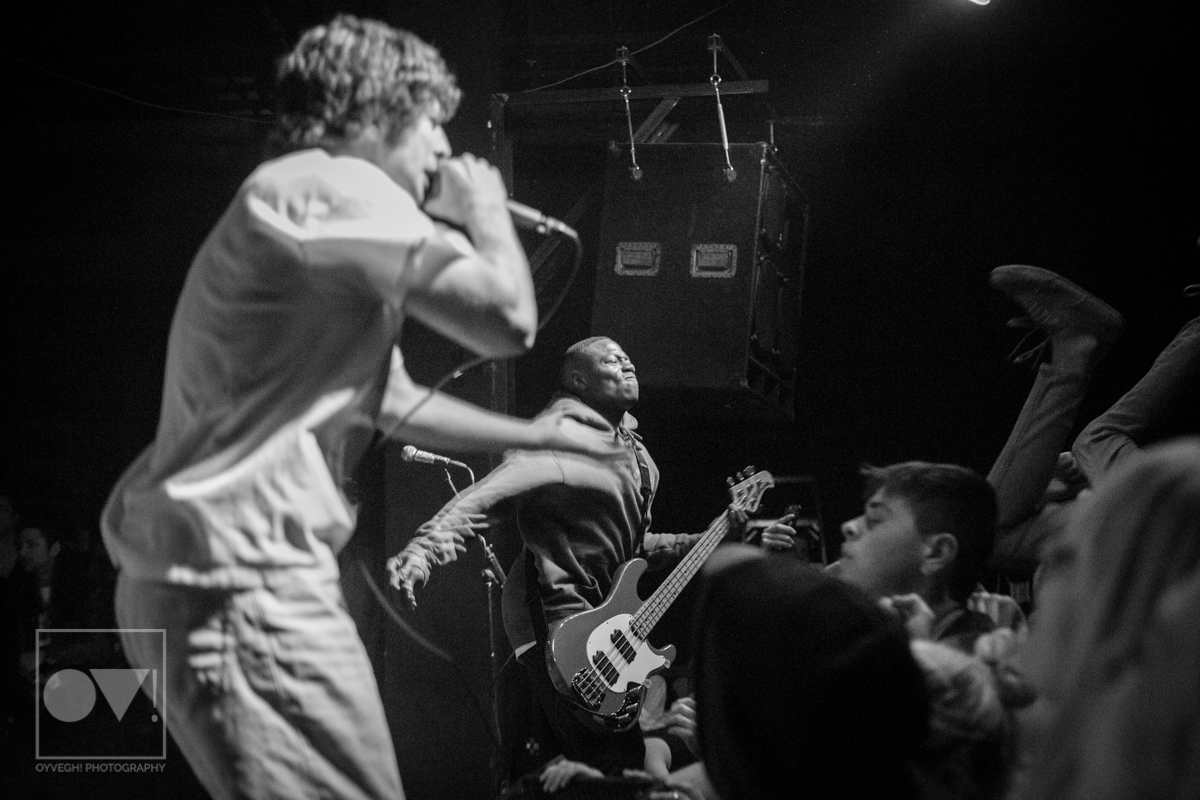 As songs like “Gravity” and “I Don’t Wanna Be Blind” played, the savage merry-go-round of guys and girls that would enter and exit the stage grew in intensity and number. Monitors and mic stands were knocked over every time someone would muster up the courage to jump the stage and surf back into the crowd. While most were lucky to be caught by waiting hands, some crash-landed onto the cement floor, only to dust themselves off and dive back in to try again. The insanity didn’t seem to bother the group, seamlessly maneuvering around people as they continued to play.
