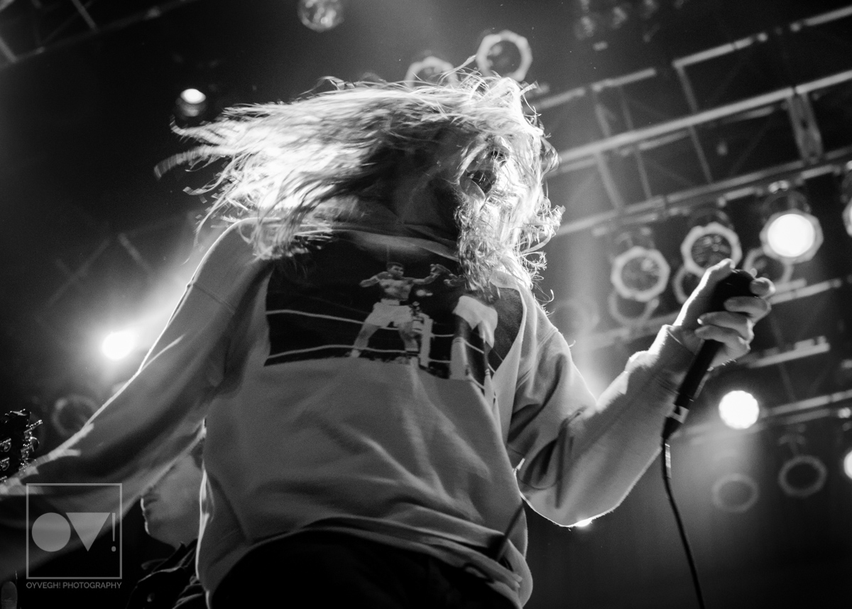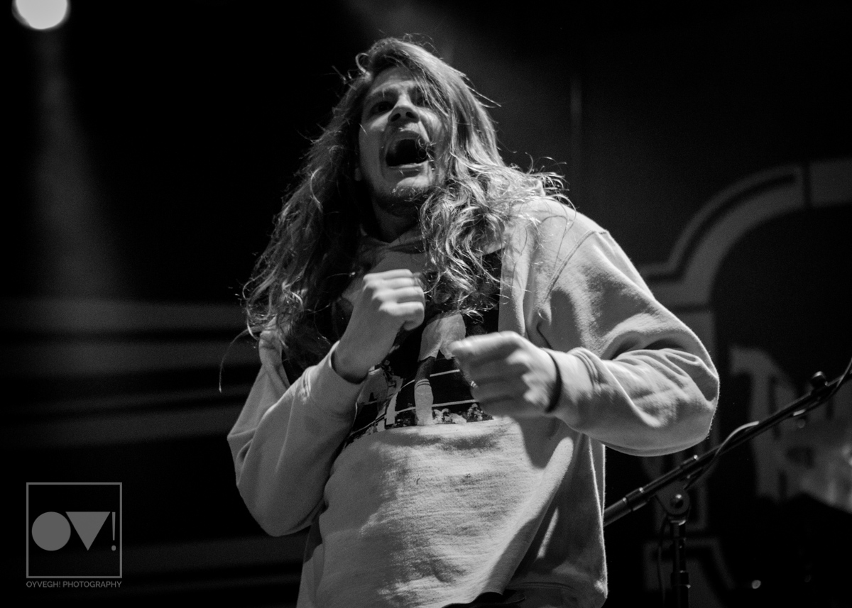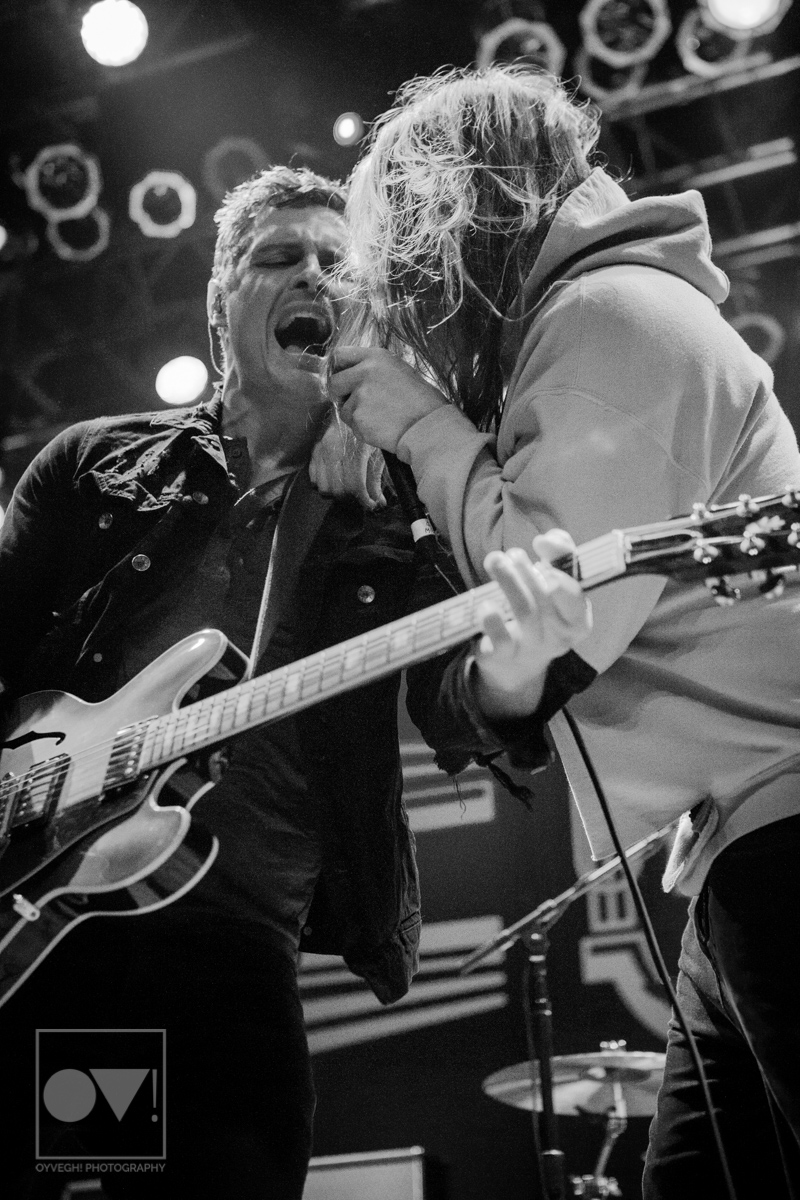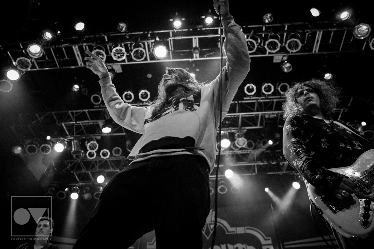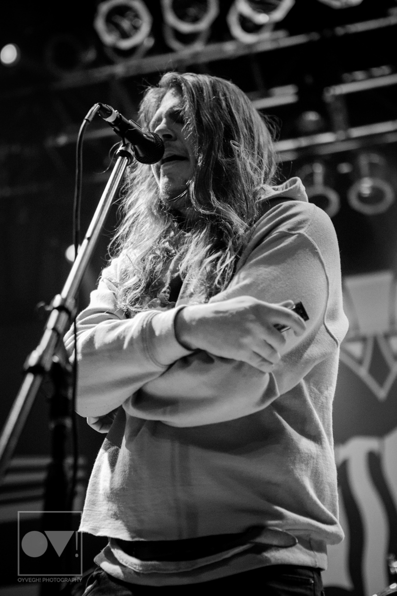 Being up close in the photo pit, Emmons looks like just a regular dude. Wearing a ratty hoodie with a photo of Cassius Clay vs. Sonny Liston printed on the front, Emmons mimicked boxing moves, punching and blocking the air as the rest of the band warmed up their guitars. But with the first words of the song “Godless, Graceless and Young”, he was ready to rock, thrashing his head, letting his hair fly wild to the wind. He prowled around to each of his bandmates, leaning on them or singing into their faces as a sort of support system to get him through each song.