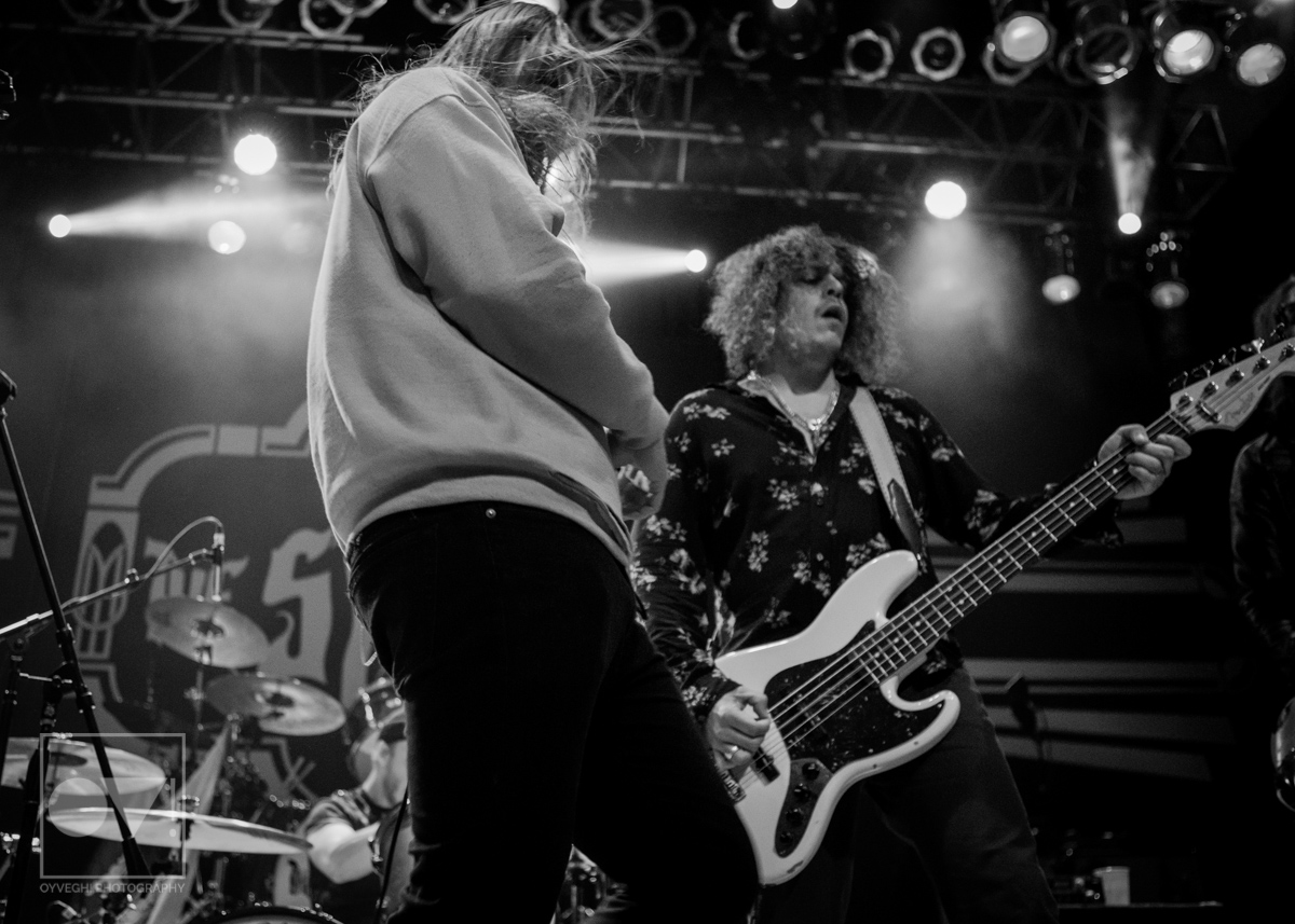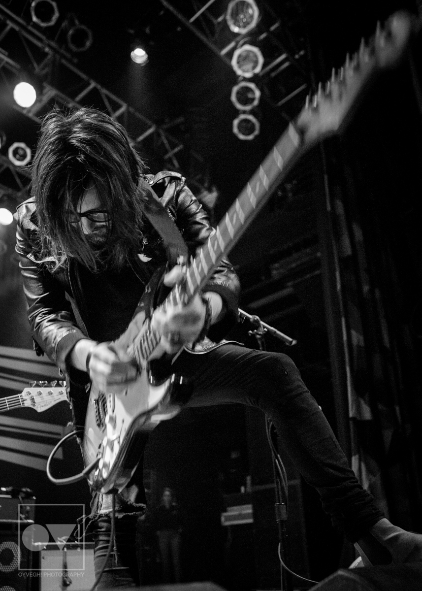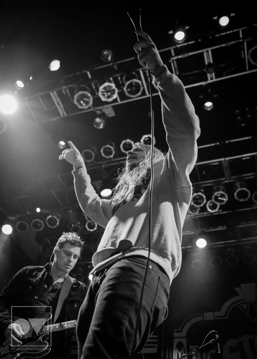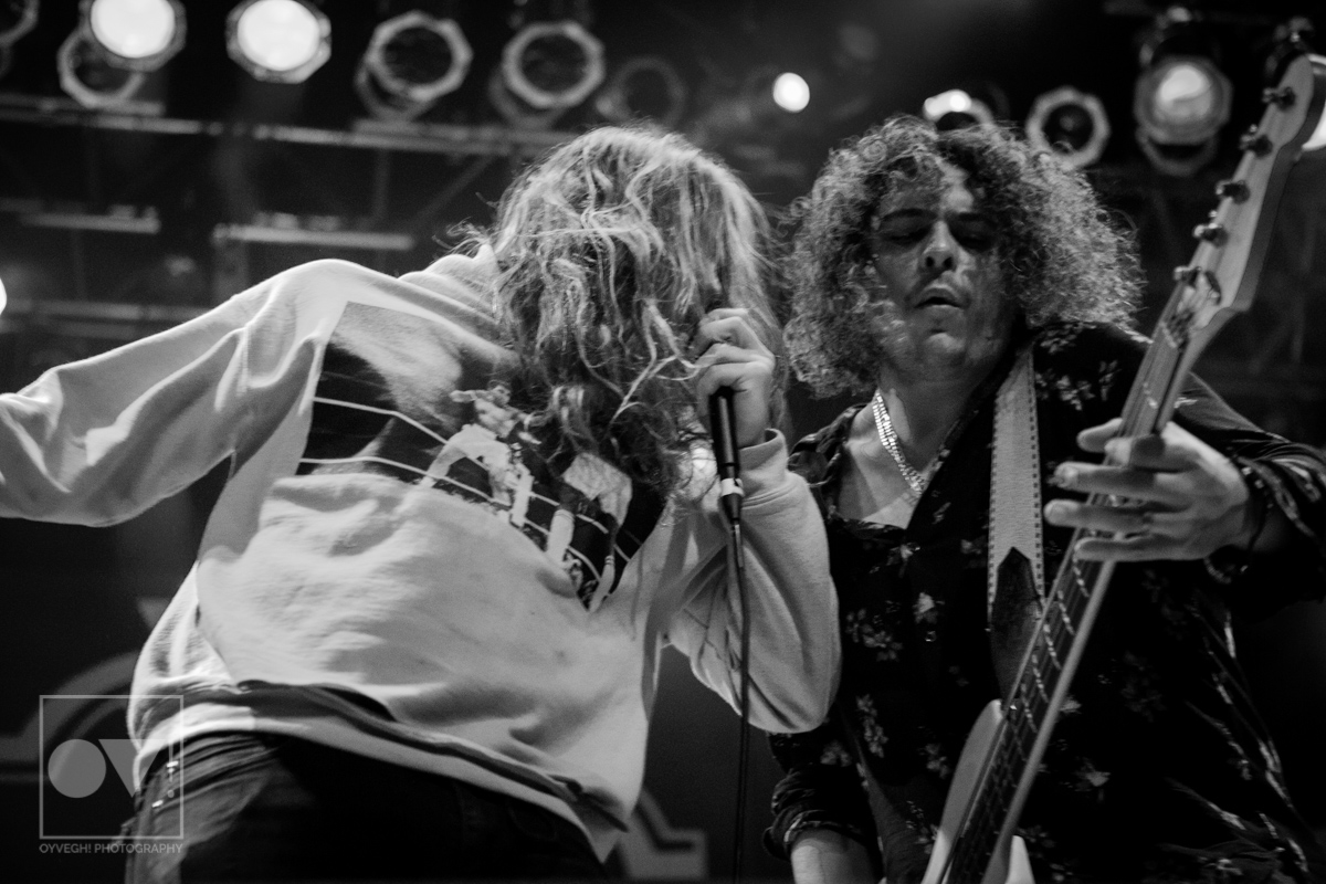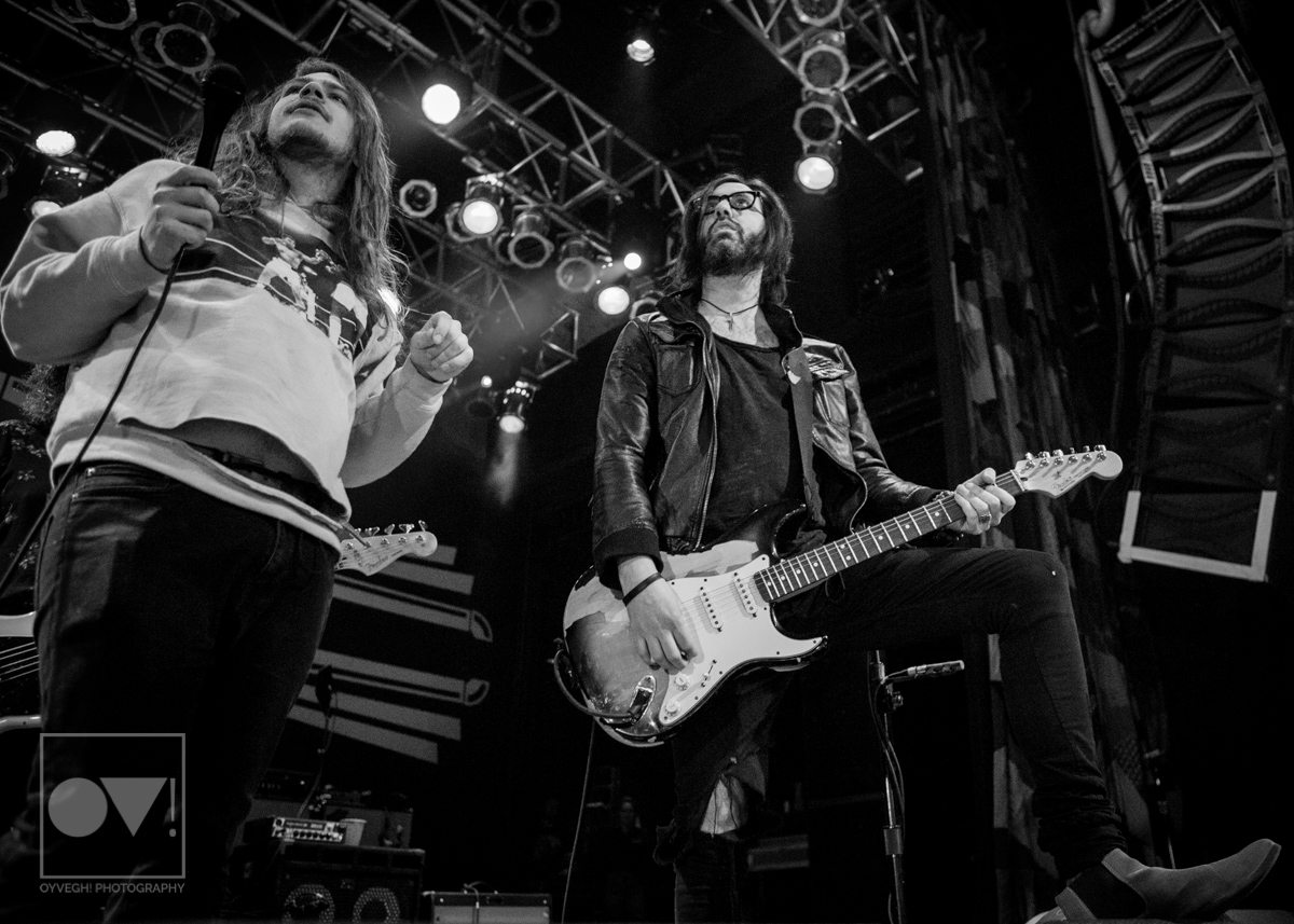 Being up close in the photo pit, Emmons looks like just a regular dude. Wearing a ratty hoodie with a photo of Cassius Clay vs. Sonny Liston printed on the front, Emmons mimicked boxing moves, punching and blocking the air as the rest of the band warmed up their guitars. But with the first words of the song “Godless, Graceless and Young”, he was ready to rock, thrashing his head, letting his hair fly wild to the wind. He prowled around to each of his bandmates, leaning on them or singing into their faces as a sort of support system to get him through each song.