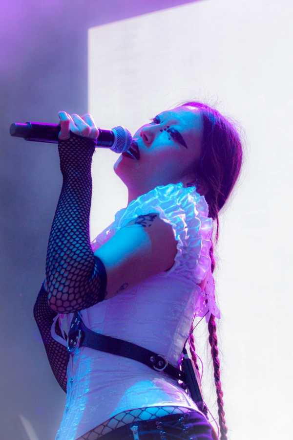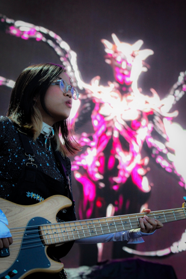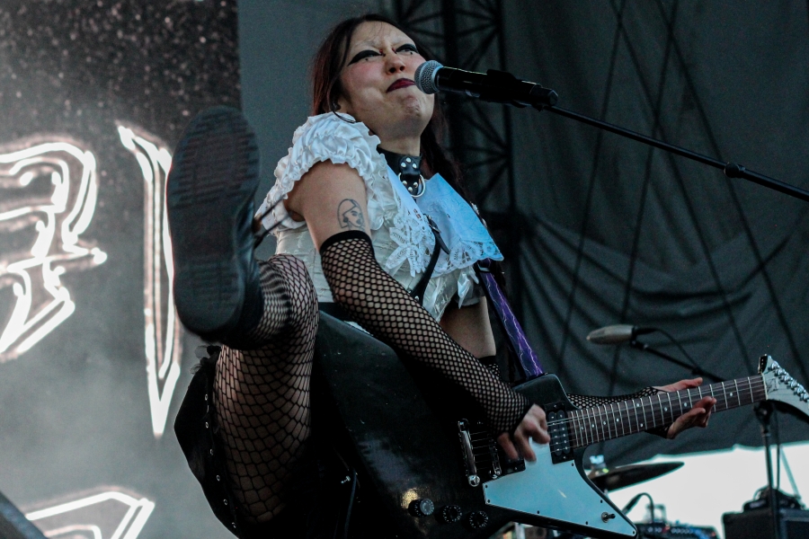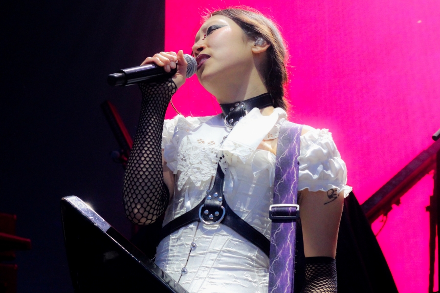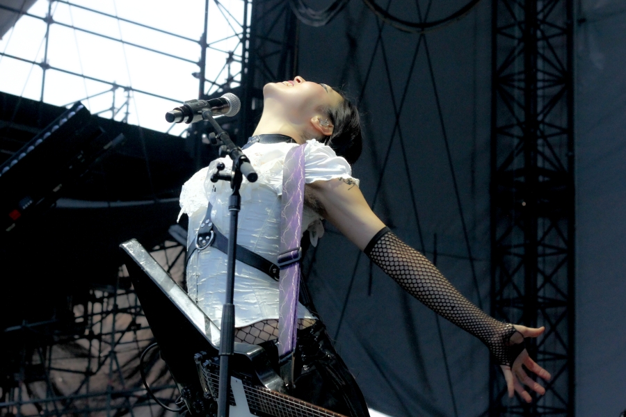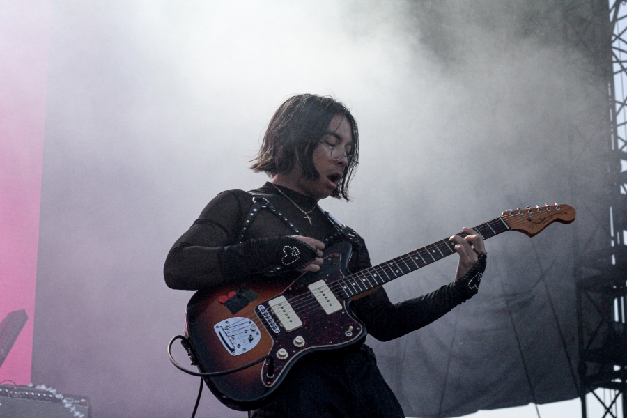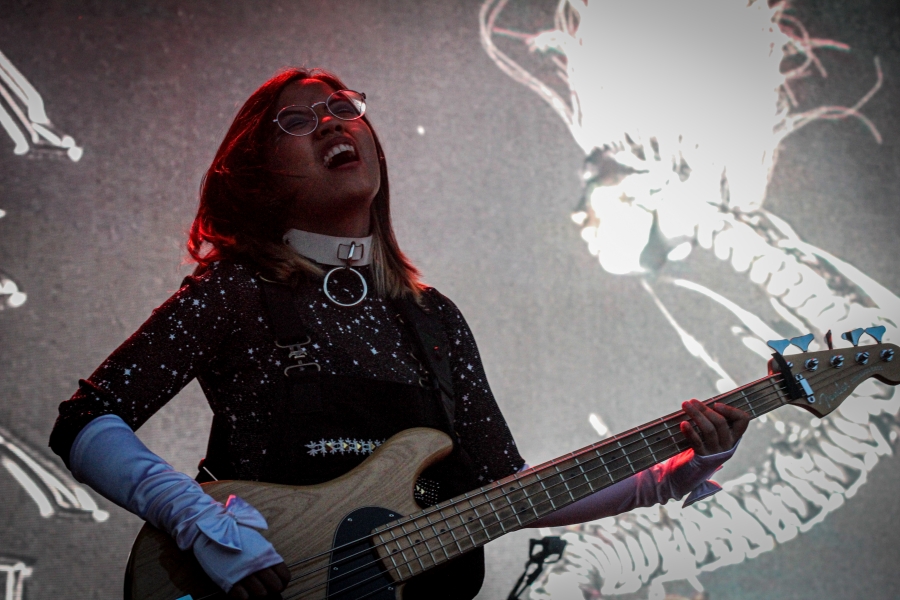 Opening act SASAMI started off the night. The singer put on a captivating performance, wielding a black and white guitar looking as if she was ready to shred like a metalhead. SASAMI and her mesh-dressed ensemble, flirted with metal, pop, and indie, showcasing their eclectic discography. She commanded the stage with grace and humor, from constantly giving her all just to hit the right notes or joking about creating a new song on the spot called “Chicago Ate My Asshole.” Accompanying this performance was wonderfully terrifying art on a screen behind the band. The strangest chrome and fiery creations loomed behind them, giving the performance an extra edge. All of this noise and beautiful singing perfectly set up the wonderful performance to come.