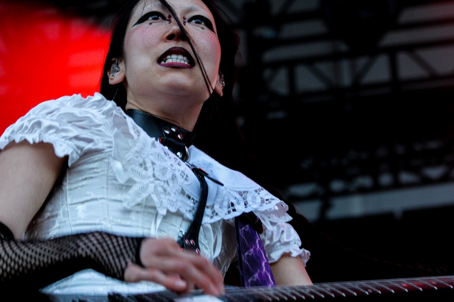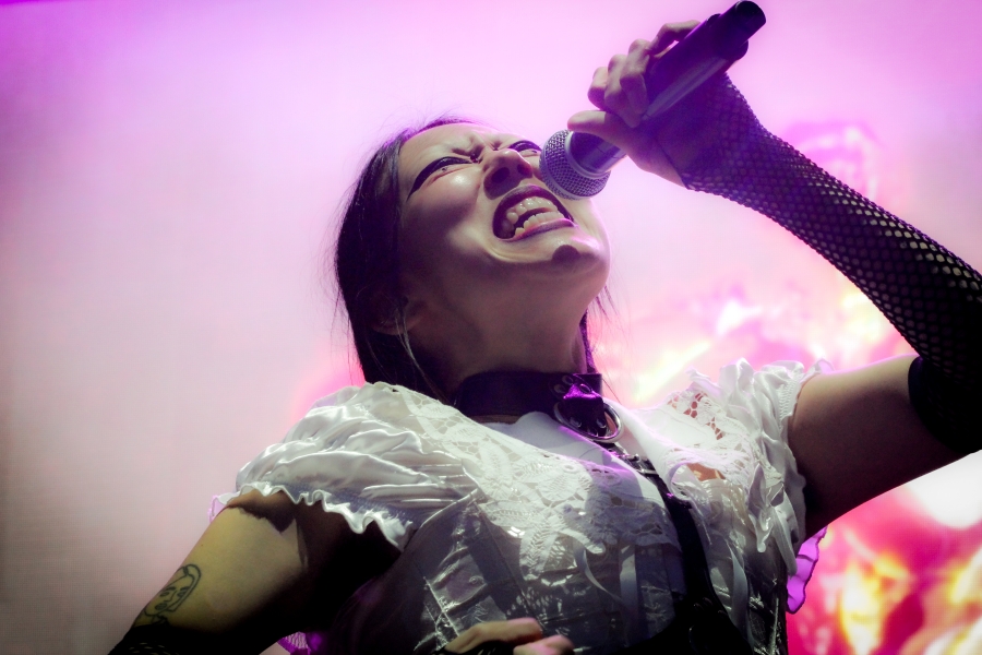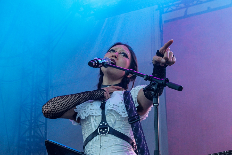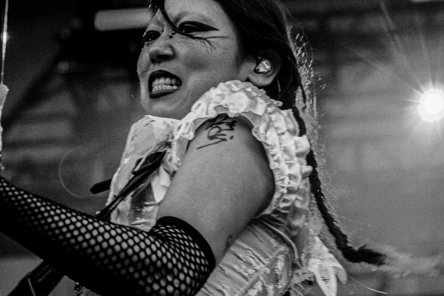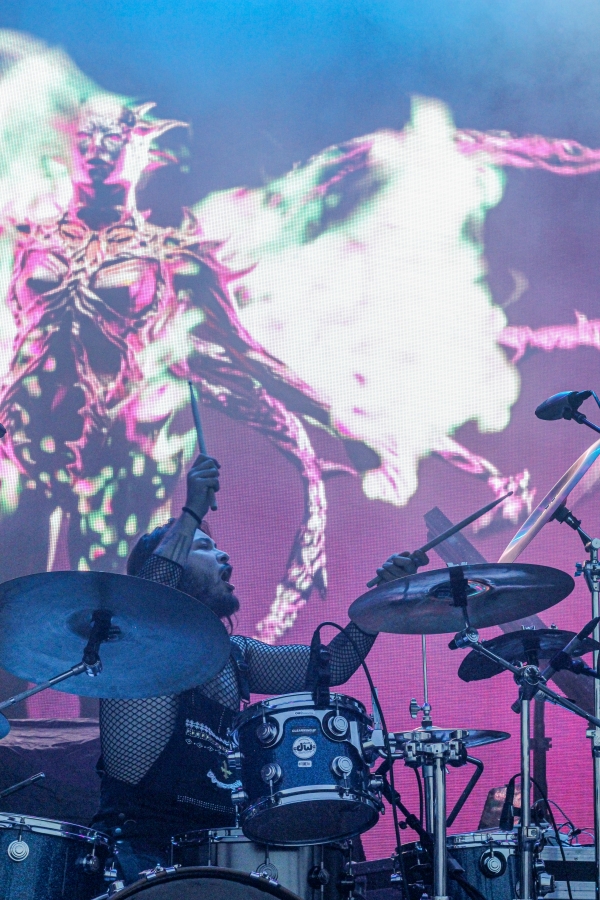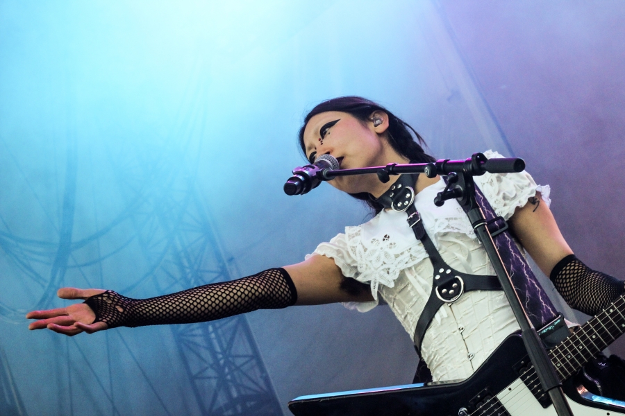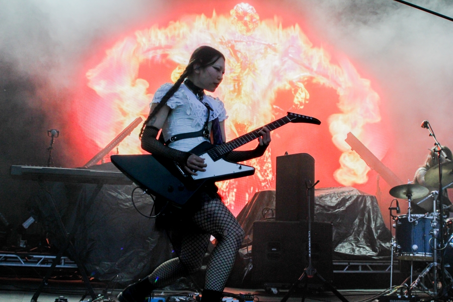 Opening act SASAMI started off the night. The singer put on a captivating performance, wielding a black and white guitar looking as if she was ready to shred like a metalhead. SASAMI and her mesh-dressed ensemble, flirted with metal, pop, and indie, showcasing their eclectic discography. She commanded the stage with grace and humor, from constantly giving her all just to hit the right notes or joking about creating a new song on the spot called “Chicago Ate My Asshole.” Accompanying this performance was wonderfully terrifying art on a screen behind the band. The strangest chrome and fiery creations loomed behind them, giving the performance an extra edge. All of this noise and beautiful singing perfectly set up the wonderful performance to come.