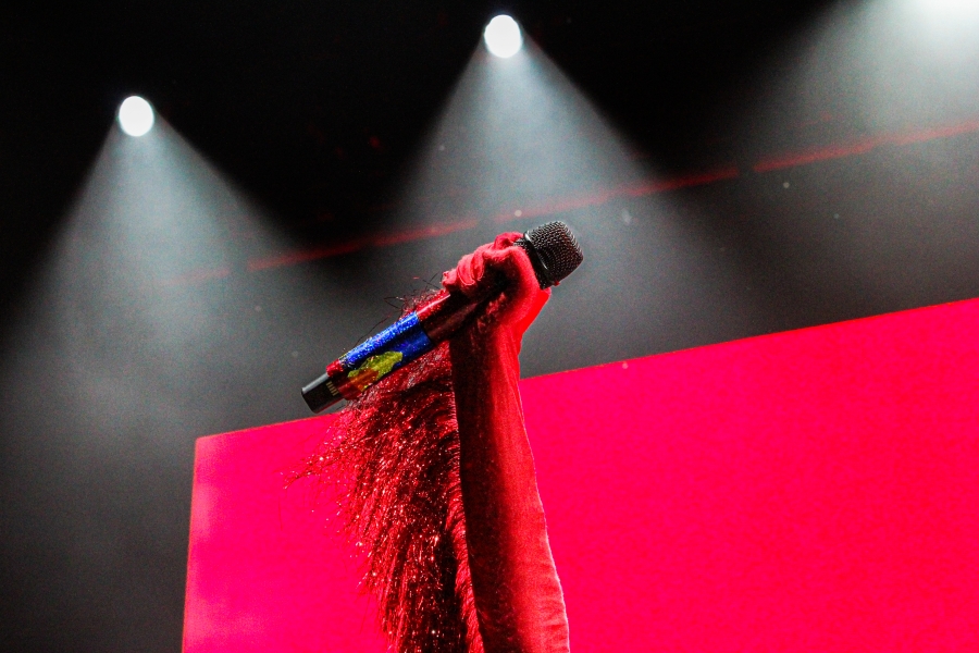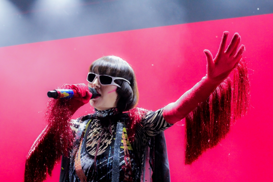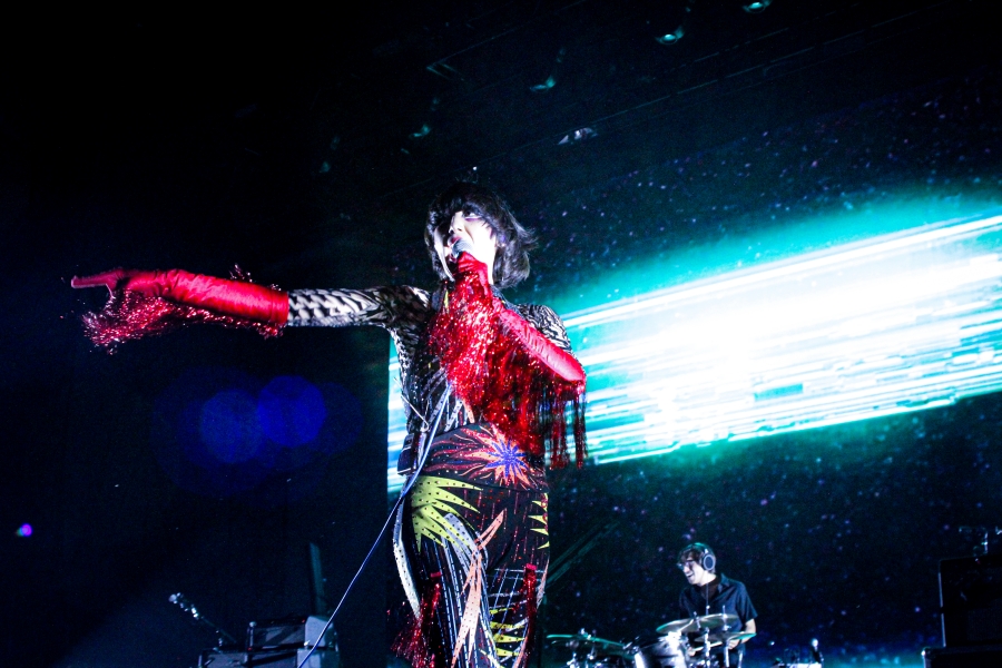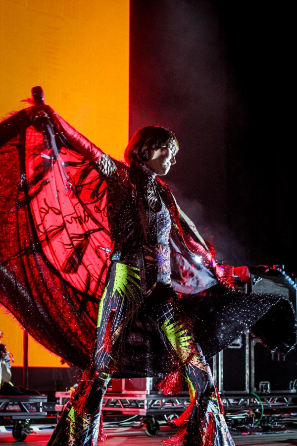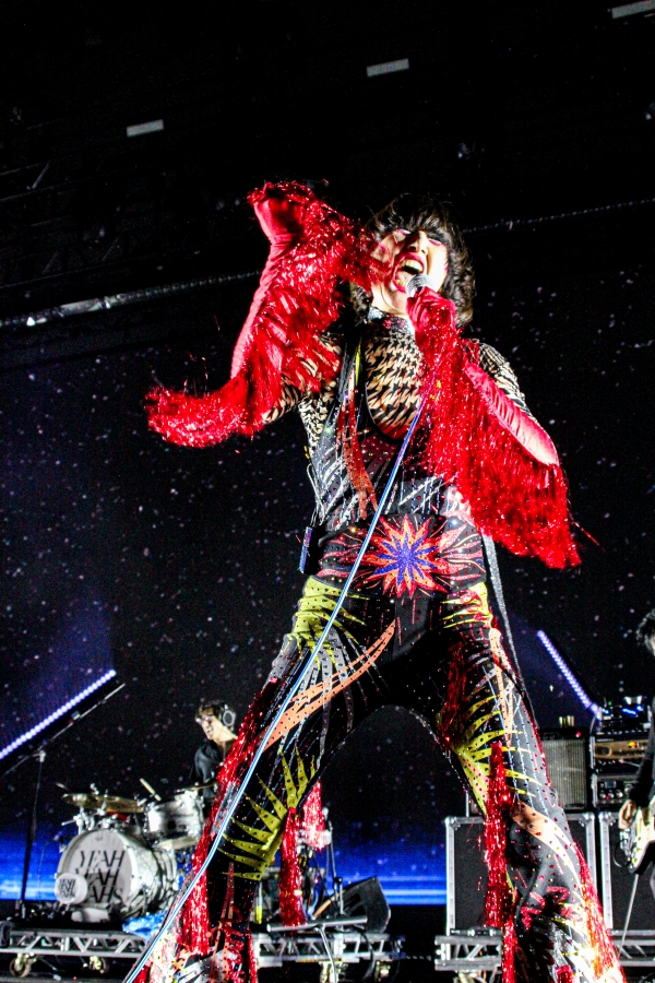 Suddenly, out comes Karen O, wearing sparkling red fringe gloves, shades, a sparkly black cape, and a colorful jumpsuit. Already smiling and laughing, Karen O begins the song, queuing that dreamy synth to a whole different level of epic. Each member of the Yeah Yeah Yeahs are extremely talented but it is almost impossible to not stay fixated on Karen O. Whether she’s spinning around in her cape or spitting water all over herself, she is a sight to behold. Not only that, but her uniquely distinct voice is just as captivating live as it is on a record. She looked as if she was having the time of her life on stage.
