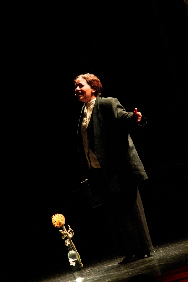 Walking into the storied Chicago Theatre, the first thing that struck you was the barebones and deliberate stage. Just a chair, a table, and a clothing rack. No spectacle, just intention. It was already apparent that this would be a different kind of night.