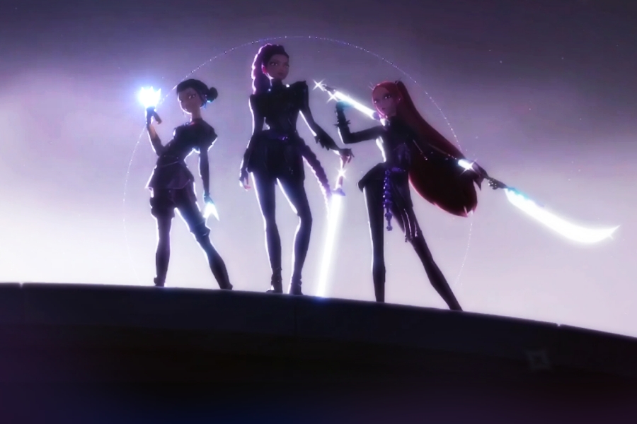 The film begins with a visually exciting history lesson. Dark entities from beneath, henceforth labeled “demons,” consume human souls on behalf of their king. Let’s not question the mechanics of their eating habits; focus on the ride. A trio of heroes surges to deter this darkness through the magic of song. This ability uses the energy of those saved souls to power a barrier, locking darkness in its own realm. According to the lesson, a trio rises in each generation to keep that barrier alive; always three girls– embedded in pop culture and loved by myriad unaware of their mission.